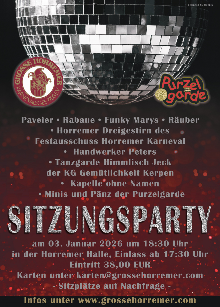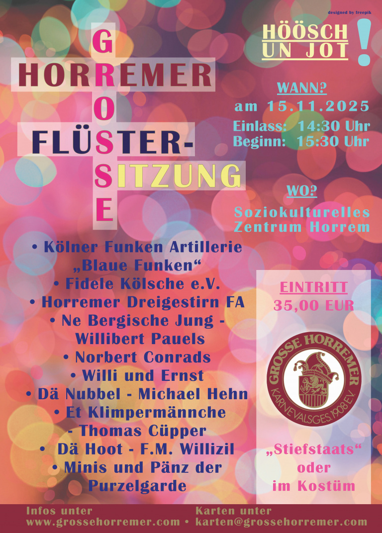 Letzte News Sitzungsparty der KG Grosse Horremer Sichert euch jetzt Karten unter: karten@grossehorremer.com Wir freuen uns auf euch ! Grosse Horremer Flüstersitzung Seid dabei ! Karten unter: karten@grossehorremer.com Nächsten Termine 12 Nov. Mitgliederstammtisch 12 Nov. 25 Horrem 15 Nov. Flüstersitzung Grosse Horremer 15 Nov. 25 Horrem 10 Dez. Mitgliederstammtisch 10 Dez. 25 Horrem 03 Jan. Sitzungsparty der KG Grosse Horremer 3 Jan. 26 Horrem kggrossehorremer Traditionsgesellschaft von 1908 e.V. 🔴⚫️🔴⚫️🔴 15.11.2025 HÖÖSCH UN JOT 🎊❤️🎉 03.01.2026 SITZUNGSPARTY 🪩🪩🪩 @purzelgarde_kggrossehorremer @jungspunde_gh In 4️⃣ Wochen startet die neue Session 2025/26 Heute zu Gast bei der @kskkoeln zur „kölschen H Kommt zur SITZUNGSPARTY am 03.01.2026 🪩🪩🪩 Impressionen unserer Grosse Horremer SOMMERPARTY 2 30.08.2025 ☀️🌺⛱️🕶️🔥🪭🍹🍰 Wir laden am 15.11.2025 um 15:30 Uhr zur Flüsters ✍🏼 Tragt es Euch in den Kalender ein: Samstag Unser Vorstand als Display-Figuren! 🤩🤓🥰 L Rosenmontag 2025 - Petrus ist definitiv „ne Köl 🖤♥️ Wir wünschen allen Jecken schöne Karn Der FA Horremer Karneval zu Gast bei @kg_schlemmae #nichtohnemeinteam @purzelgarde_kggrossehorremer A @stadtgardekerpen präsentiert Stippefott - und un Unsere TOP 3️⃣ Live-Auftritte für Partystimmu 🫶🏼 Daaanke für das positive Feedback zu uns Heute zu Gast bei Freunden @kg_altstaedter_blau_wi SITZUNGSPARTY 2025 - danke an alle Künstler und G Jahresrückblick 2024 - danke das ihr ALLE ein Tei Mehr laden Auf Instagram folgen Alle News Alle Termine